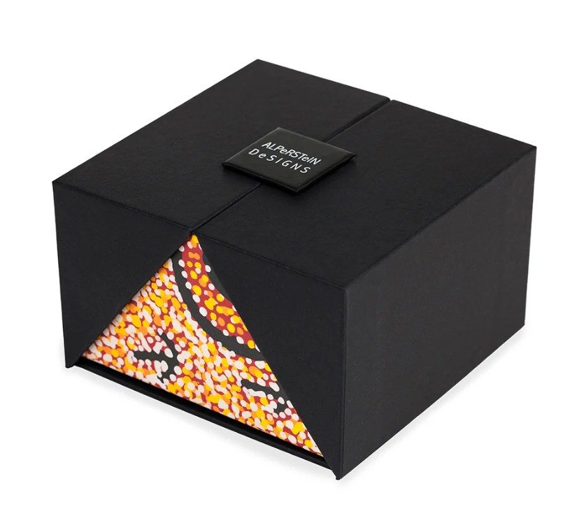 The Margaret Nangala Gallagher Silk Tie Set combines elegance and cultural heritage with a 100% silk tie and matching pocket square featuring striking Aboriginal art. Gift boxed for a polished presentation, this set adds a refined and meaningful accent to any formal look, making it an exceptional choice for yourself or as a thoughtful gift.
