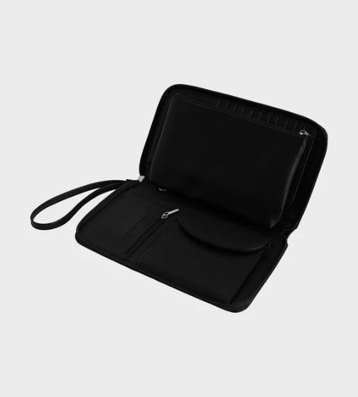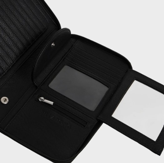 Product Description Zip coin compartment Multiple card sleeves Interior pockets Detachable wristlet Detachable interior pouch 13 x 21.6 cm Metal logo badge Embossed mandala art Style 24E601671-BLK
