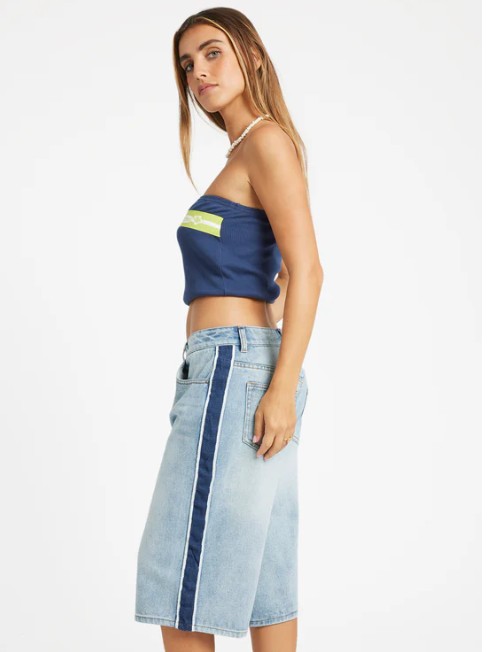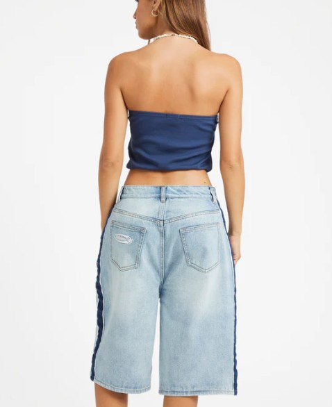 Product Description Denim jort Relaxed fit Mid rise 11.25" inseam Zip fly with button closure Back pocket embroidery Contrast side panels Style 24B204571-ATD