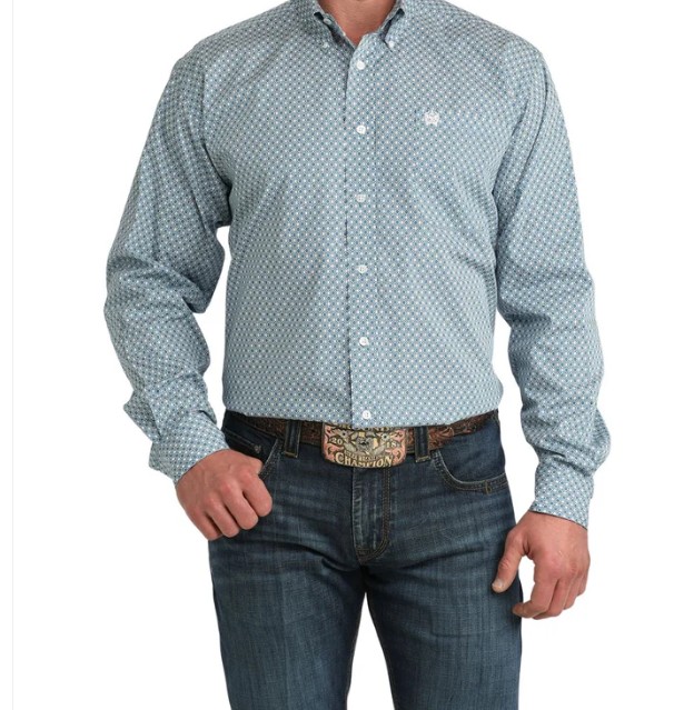 Printed Cotton Plain Weave; Classic Fit; Long Sleeves; Button Down Collar, Placket, And Cuffs; White Buttons; Single Open Chest Pocket With Logo Embroidery; Straight Back Yoke With Box Pleat; Geometric Print; Color: Blue; Style #MTW1106048