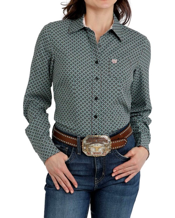 This women’s western shirt from Cinch will look so perfect on you. This long sleeve shirt has a button front closure with gray buttons. This gray geometric floral print shirt has pink mini check and dot print inside trim. Made with polyester. Cinch Style Number MSW9164240.