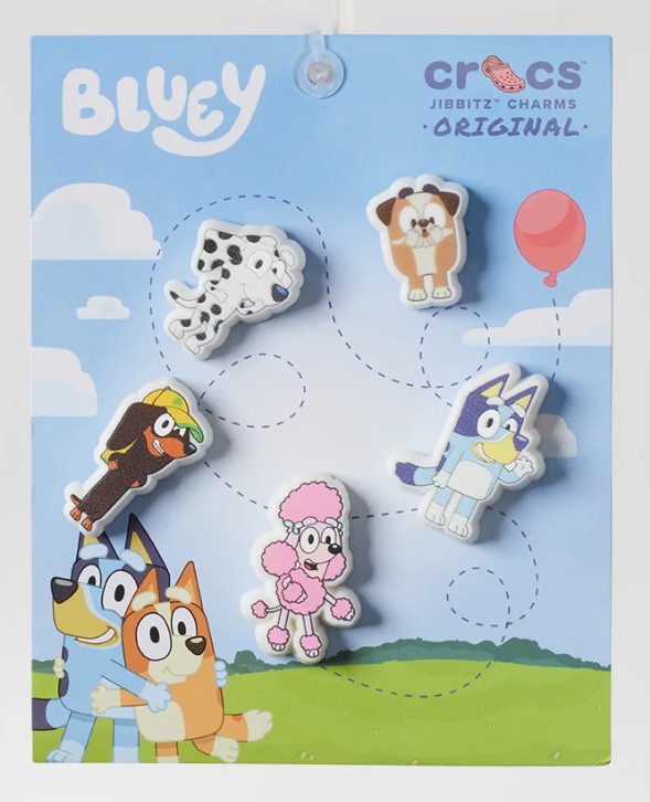 Pop some personality into your shoes with the Bluey 5 Pack Jibbitz™ charms from Crocs. Bluey and her friends make the perfect addition to your favourite pair of clogs, slides, and more.