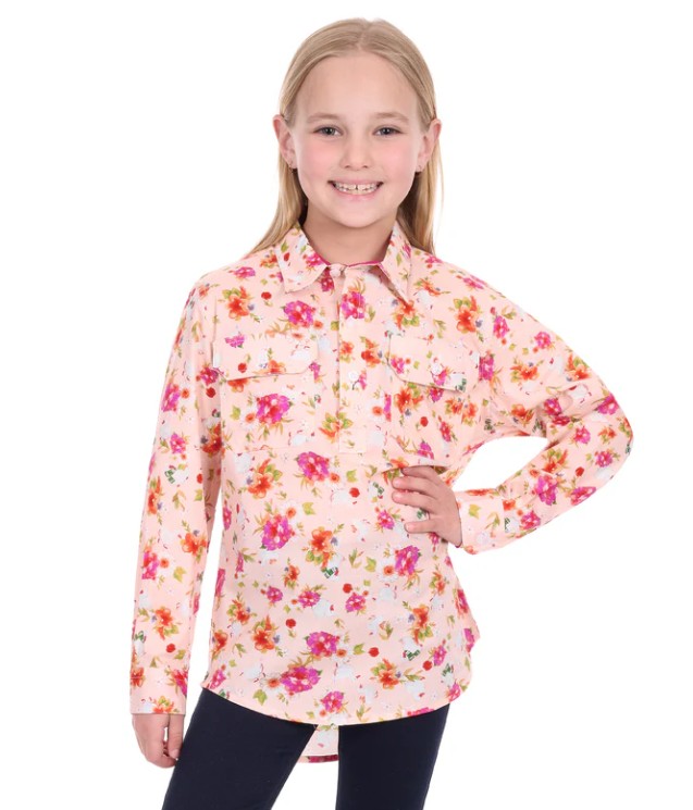 Introduce your child to classic Western style with the Hard Slog Kids Lily 1/2 Placket Long Sleeve Shirt. Made from 100% cotton print fabric, this shirt offers breathability and comfort for all-day wear. The practical half placket design features two functional pockets, perfect for storing small treasures, while logo buttons add authentic branding. The contrasting inside collar stand provides a refined finishing touch that sets this shirt apart. Durable and stylish, it's an essential addition to any young rider's wardrobe.