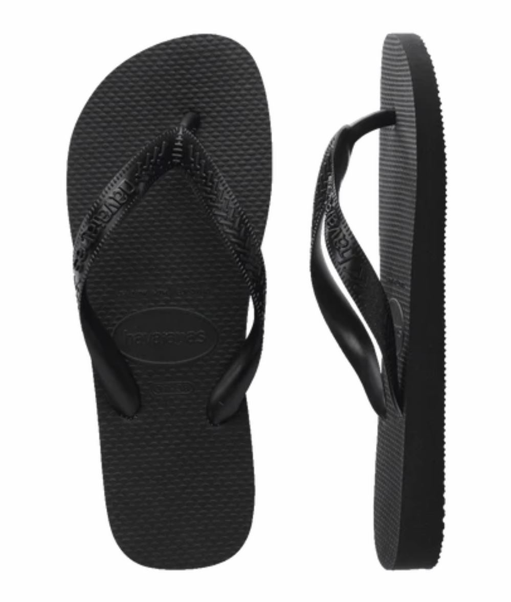 Havaianas Top Black thongs. It's back to basics with our classic thongs for men and women. Classic black top Havaianas with matching top black Havaianas straps. These classic pair of thongs will become your wardrobe staple this summer. All Havaianas thongs are made from premium Brazilian rubber.