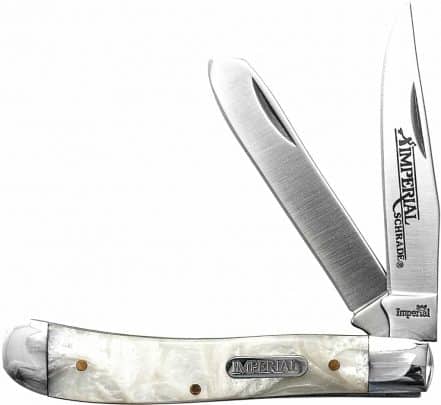 Imperial Large Trapper Folding Pocket Knife, 3.88 inch closed. Stainless clip and spey blades. Cracked ice celluloid handles with nickel silver bolsters and Imperial inlay shield
