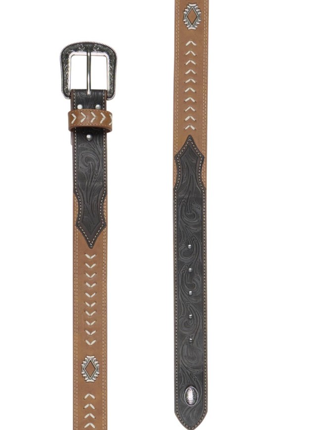 Tooled basketweave tab ends, handlace detail, Aztec feature conchos, removable buckle, Pure Western concho, antique silver hardware