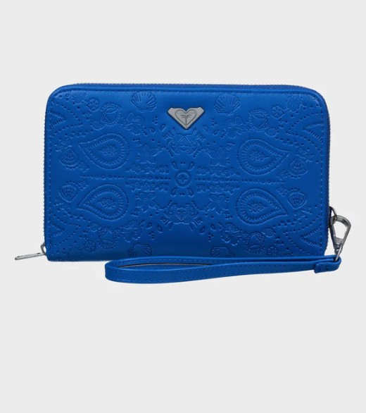 Product Description Zip-around closure Internal zip pocket Internal card slots Transparent ID window Roxy metal plate Embossed artwork Removable wristlet Dimensions: 4.9" x 7.5" x 1"