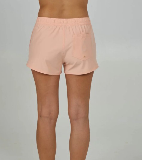 The Beacons Short in Peach Fizz features a scalloped hem, elastic waistband with drawcord, and a rear patch pocket with shock cord, drain hole, and Velcro closure. Made from REPREVE recycled performance fibers, it offers 4-way stretch, quick-dry performance, and Salty Crew branding at the front hem and back pocket.