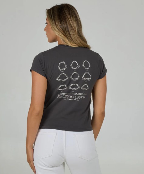 The Jawbone Modern Tee in Charcoal is a slightly fitted tee with capped sleeves, featuring screen printed chest and back prints.