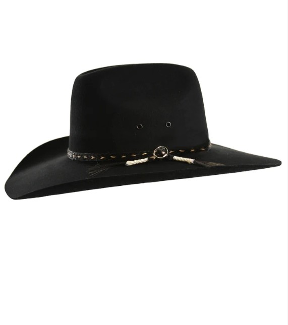 100% Pure Wool Felt Removable braided hat band with detachable feather, adjustable with metal ring, Thomas Cook metal logo pin, fully lined crown, leather sweatband, metal eyelets for breathability. Shower proof. Australian Wool.