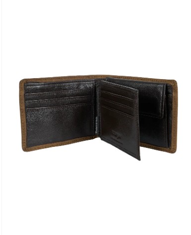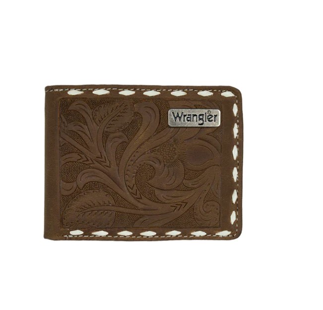 Bifold closure, tooled front panel, contrast handlace, 6 x card slots and 1 x ID slot, 2 x note pockets, coin pocket with snap closure, 1 x zip pocket, Wrangler® iconic logo concho, RFID